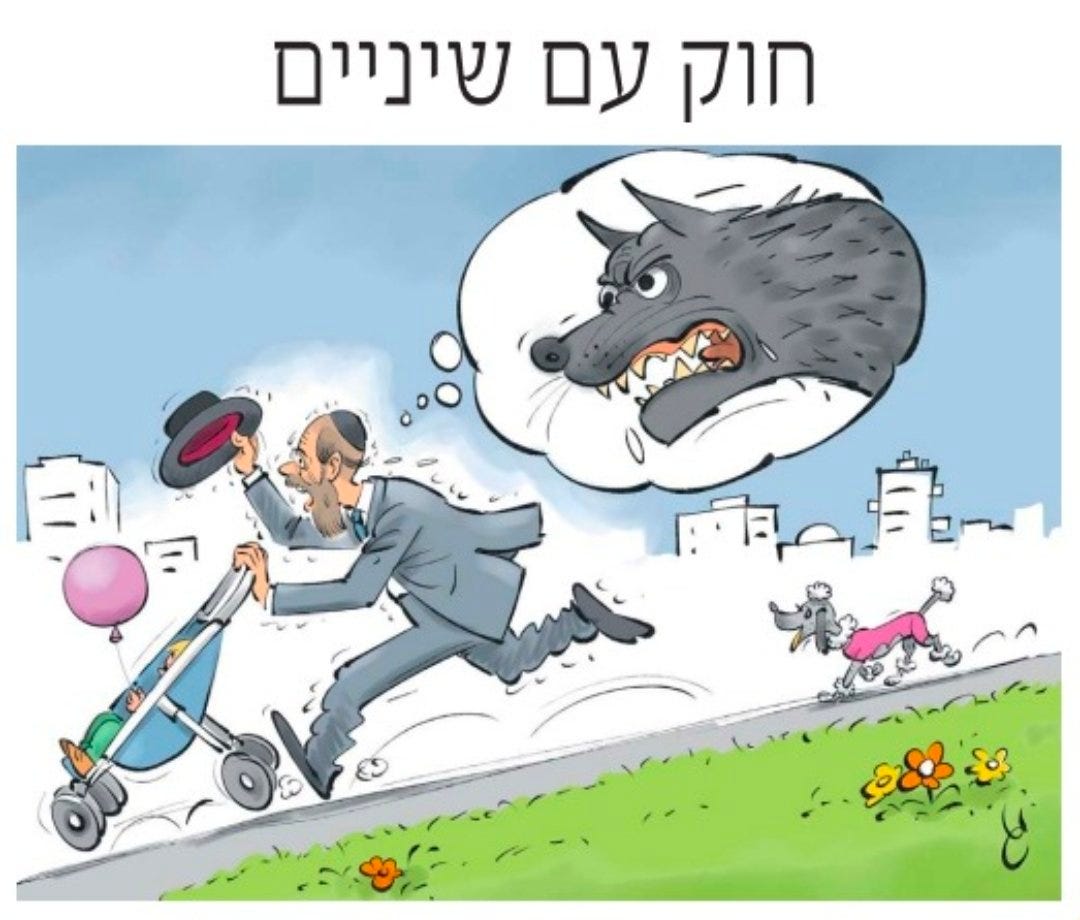 Now I’m not going get into his distortions of what the proposed law actually proposes to enforce, which is not at all as he describes it. Suffice it to say that Yated Ne’eman published a remarkable cartoon to reassure its readers who are concerned about the threat of a law that has “teeth”: