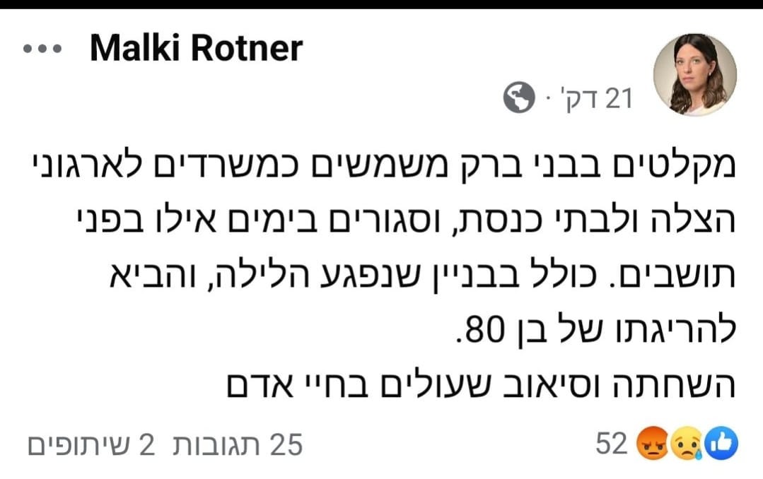One is that they simply couldn’t get to a shelter. The Bnei Brak municipality doesn’t have them available for public use, because they requisitioned them for various organizations, shuls and so on, and they are locked at night. According to one report, this was the case with the shelter for the building where the elderly man was killed.