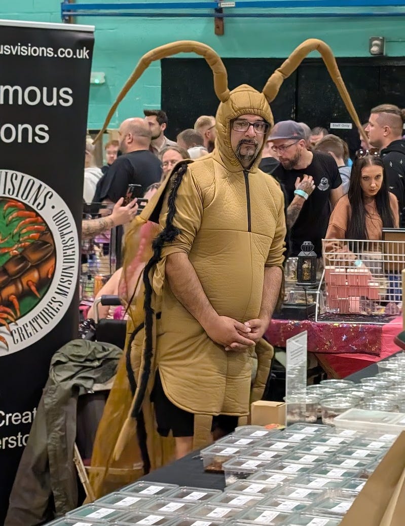 England has an extraordinary community of exotic insect enthusiasts, perhaps the best in the world. (Being a cold island, there is no risk of the insects escaping and becoming dangerous invasive species.) The people were a mixed bunch; nerdy scientific types, heavily tattooed and abundantly pierced goth types who rattled off endless Latin names of different species, even a man dressed as a giant cockroach.