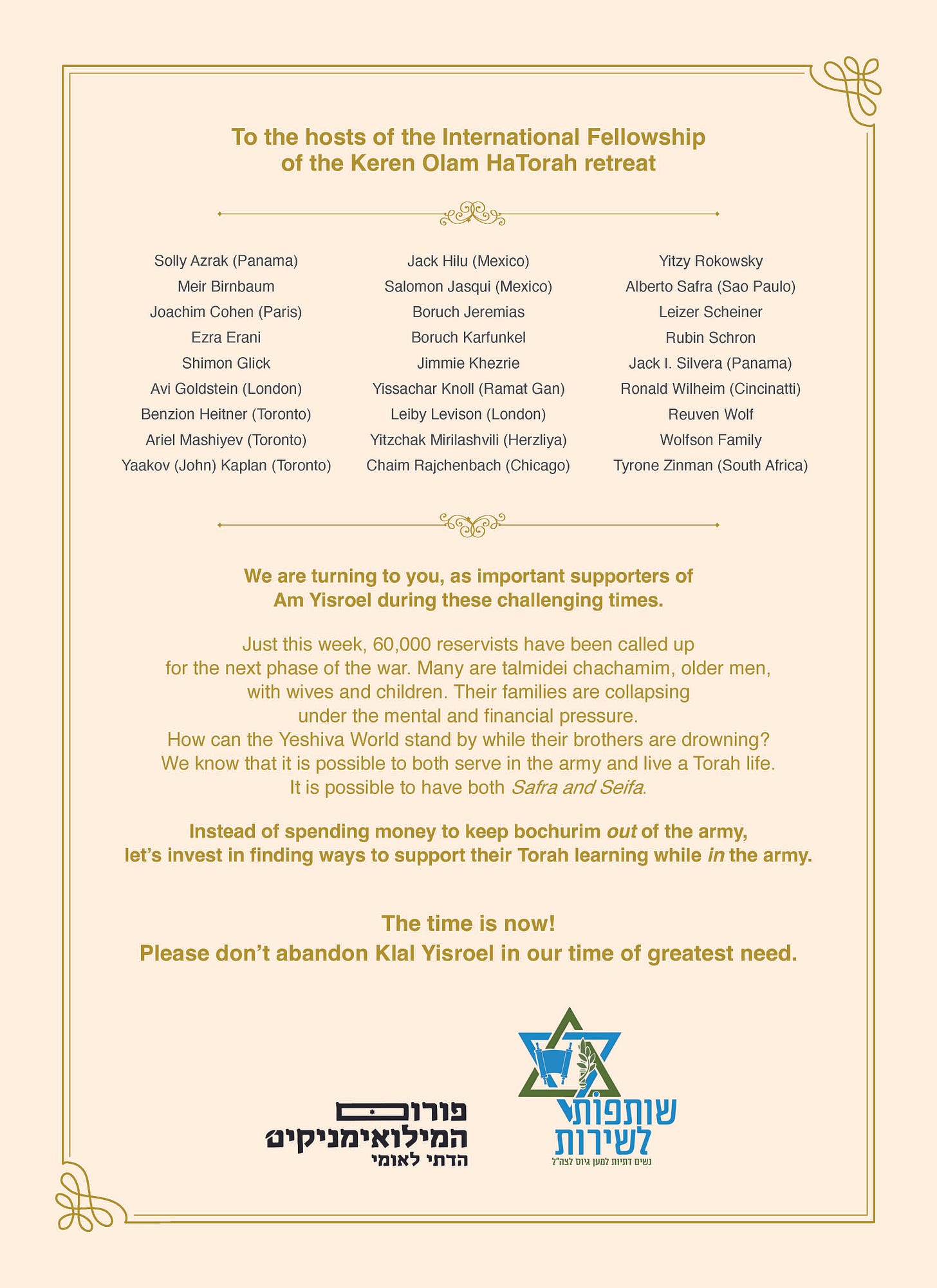 In the ongoing struggle to try to get charedim to help relieve the appalling suffering and strain upon the reservists, there is a significant new development. A fascinating large advertisement appeared in The Jerusalem Post this weekend. It was a letter addressed to 27 wealthy philanthropists, who are invited this week to a special retreat to raise funds for the charedi yeshiva world: