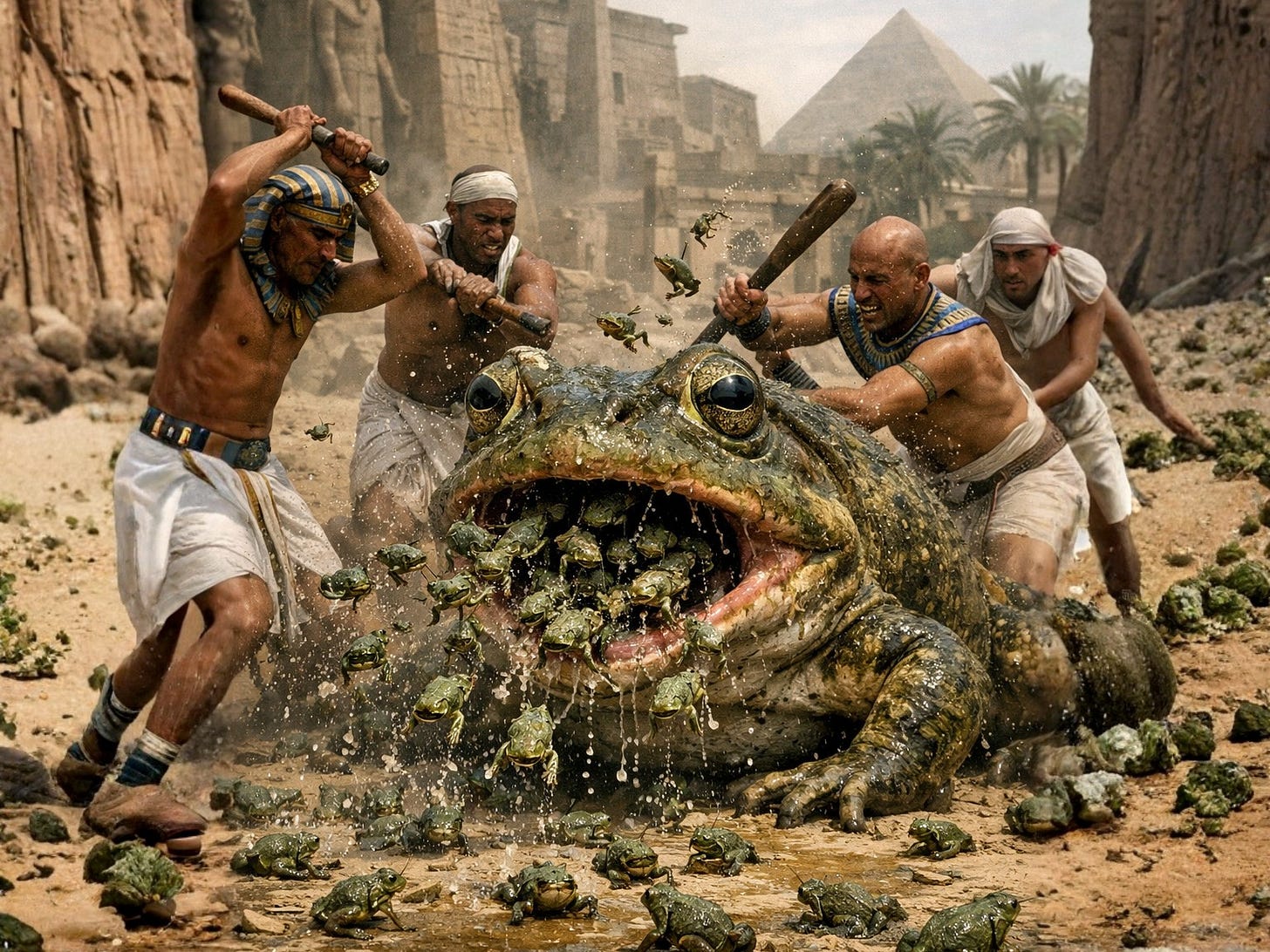 One verse says, “and the river swarmed with frogs,” and another verse says, “and the frog came up.” Rabbi Akiva said, There was one frog, and the Egyptians were beating it, and many frogs showered from it (matezes). (Midrash Tanchuma, va’era 14; Tanna D’Vei Eliyahu Rabbah 7)