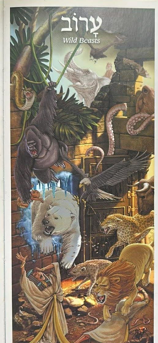 Now let’s turn to the fourth plague, arov. “Everyone knows” that this plague was wild animals. If you’re more into supernatural extremes, it was polar bears arriving on ice from the North Pole, along with giant octopuses coming out of the ocean and using their tentacles to unlock the Egyptian homes from the inside (as presented in one illustrated haggadah below, based on the Gra and various midrashic lore). If you’re more into naturalistic miracles, it was the wild animals of Egypt - lions and leopards and hyenas (not tigers or bears, which did not live in Egypt).
