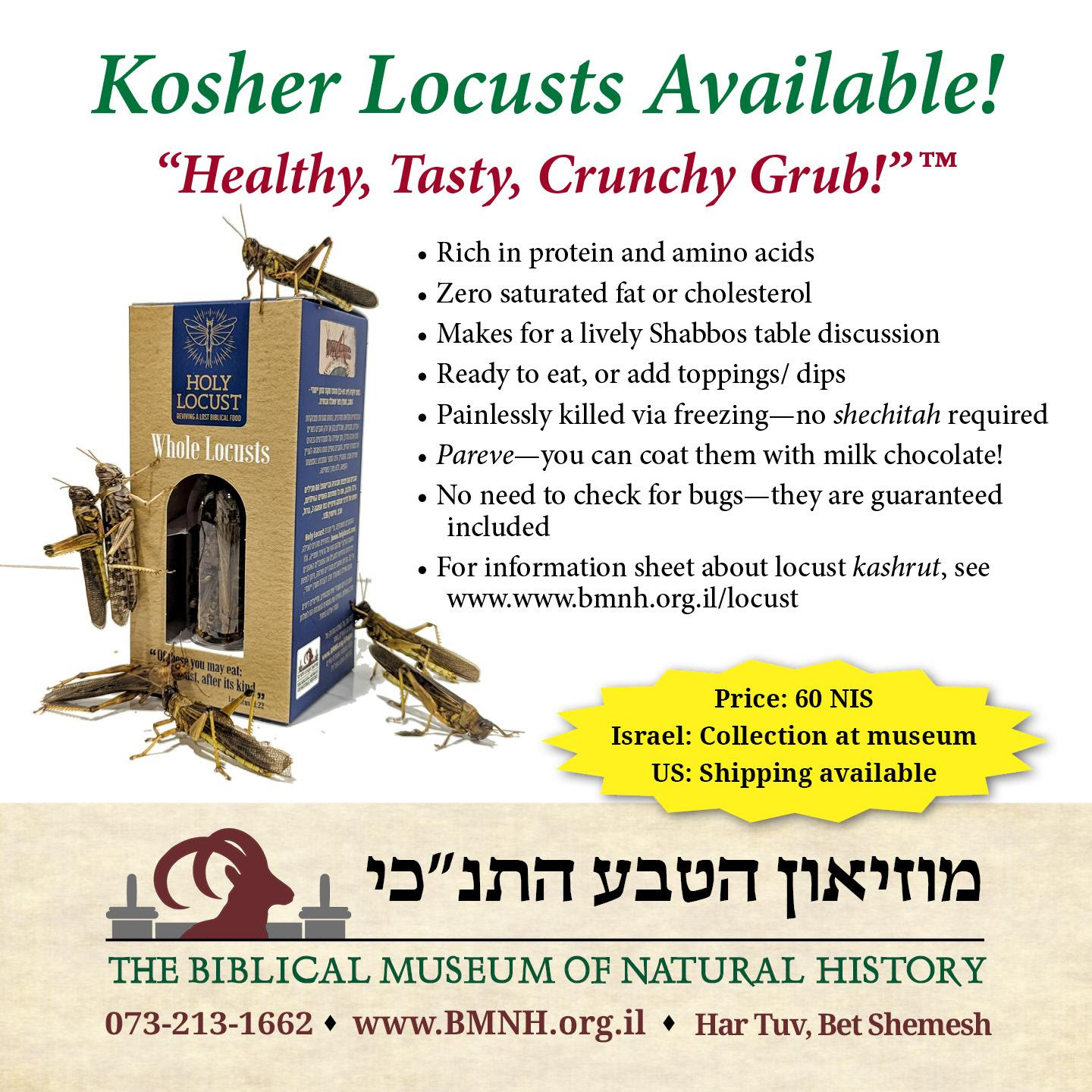First, please note that once again the Biblical Museum of Natural History is selling kosher locusts to liven up your Seder table! In Israel, they can be collected from the museum (and we might arrange collection points elsewhere due to the travel challenges caused by the war). In the US, you can order them online; DHL is due to get them to our US distribution office in time for them to get to you by Pesach, but please note that this cannot be guaranteed. While you’re ordering your locusts, note that you can also order my books at a discount.