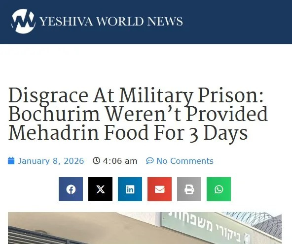 However, there is something else that I would like to focus on: the expectation that charedi standards of kashrus and other things must always be met, whether in military service or in prison. And this is put forth as one of the very reasons why charedim will not serve in the army. They deny that such standards are met. This was most recently argued by TV personality Yedidya Meir as providing sufficient justification for even non-learning charedim not to enlist, on the ironically-named Israeli television show "The Patriots.”