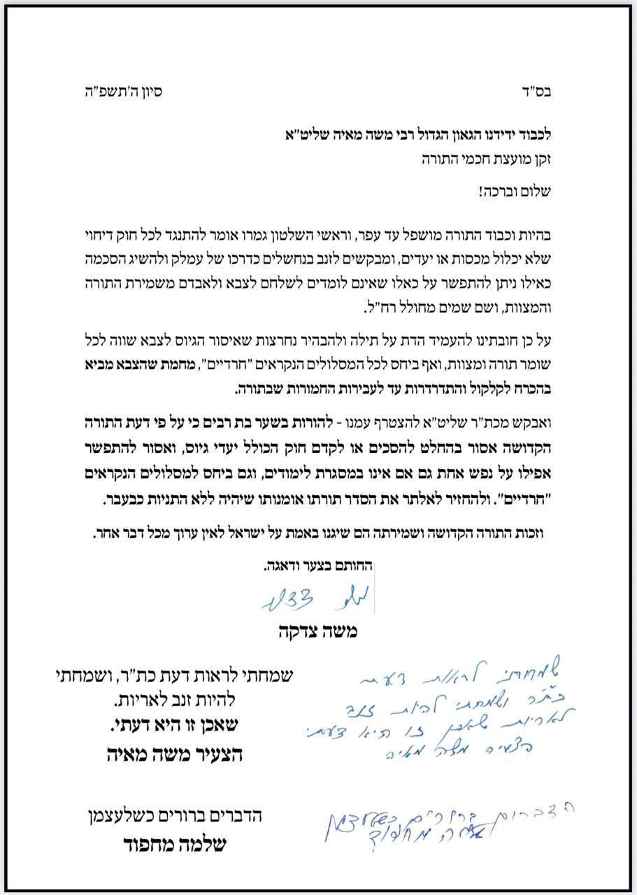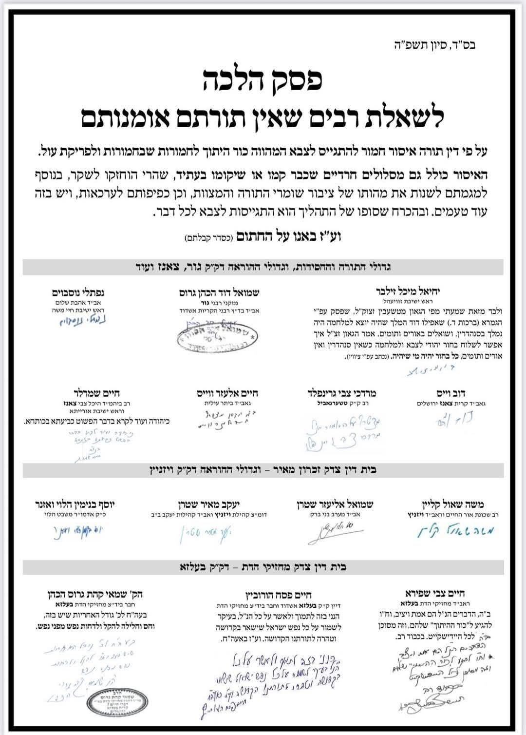 Leading figures of the major chassidic sects - Gur, Tzanz, Vizhnitz, Belz - along with a major Sephardic authority and R. Machpud have signed an announcement - a halachic ruling! - that is is forbidden for any religious Jew to enlist in the IDF, period. It is specifically addressed to those who are not involved in Torah study. While there is no letter from Litvishe rabbinic leaders, they have made it clear that their position is the same.