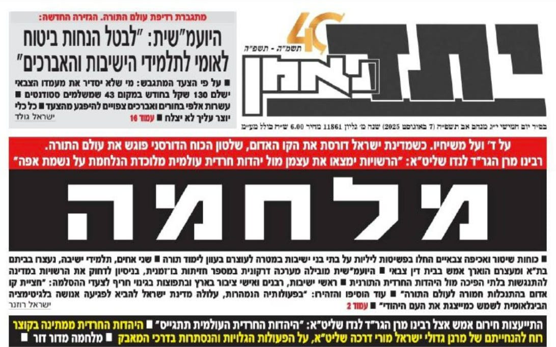 For much of the last two years, Israel has been fighting against seven entitities that declared war upon it: Gaza, Hezbollah, Iran, Syria, Yemen, Iraq militias, and various Palestinian forces in the West Bank. Now, there’s an eighth war: the charedim. This was officially declared last week in a huge banner headline on the front page of Yated Ne’eman: