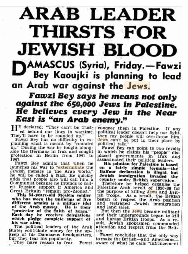 But how did they see that happening? The answer is that they left under the assumption that the Arab states would succeed in their declaration that they would annihilate the Jews, and that they would thus be able to soon return. To pick just one example, here’s the Daily Mirror, Sept 12, 1947: