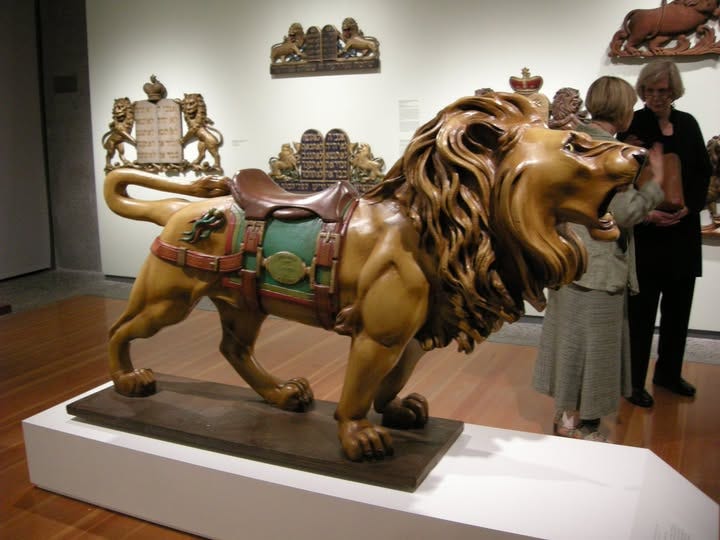 And here’s a photo from the exhibit, which ran from 2007 to 2008. On the wall at the back are lions from synagogues; in the foreground is a carousel lion carved by Marcus Charles Illions (1874–1949). Born in Vilna, at age 7 he started apprenticing as part of the Eastern European Jewish tradition of magnificent wooden Torah arks. The Vilna Lion-Carver later ended up in Coney Island, working with other Jewish immigrants on carving animals for carousels!
