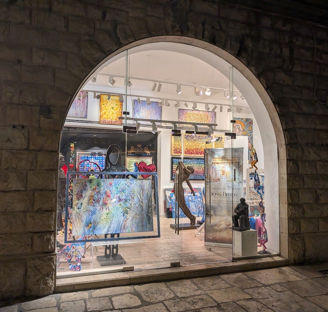 And then one evening during the time that I was grappling with this problem I was driving in Jerusalem and got hopelessly stuck in traffic on King David Street. Nothing was moving. So I absent-mindedly started looking around at my surroundings. To my right was a very large expensive art and Judaica store, with a large glass-walled front display room, filled with all kinds of things. No carved lions in the room! But I looked through my car window, through the store window, all the way to the very back of the room, and there was a doorway. And through that doorway, I saw a pair of carved lions on the wall! See if you can make them out in this photo.