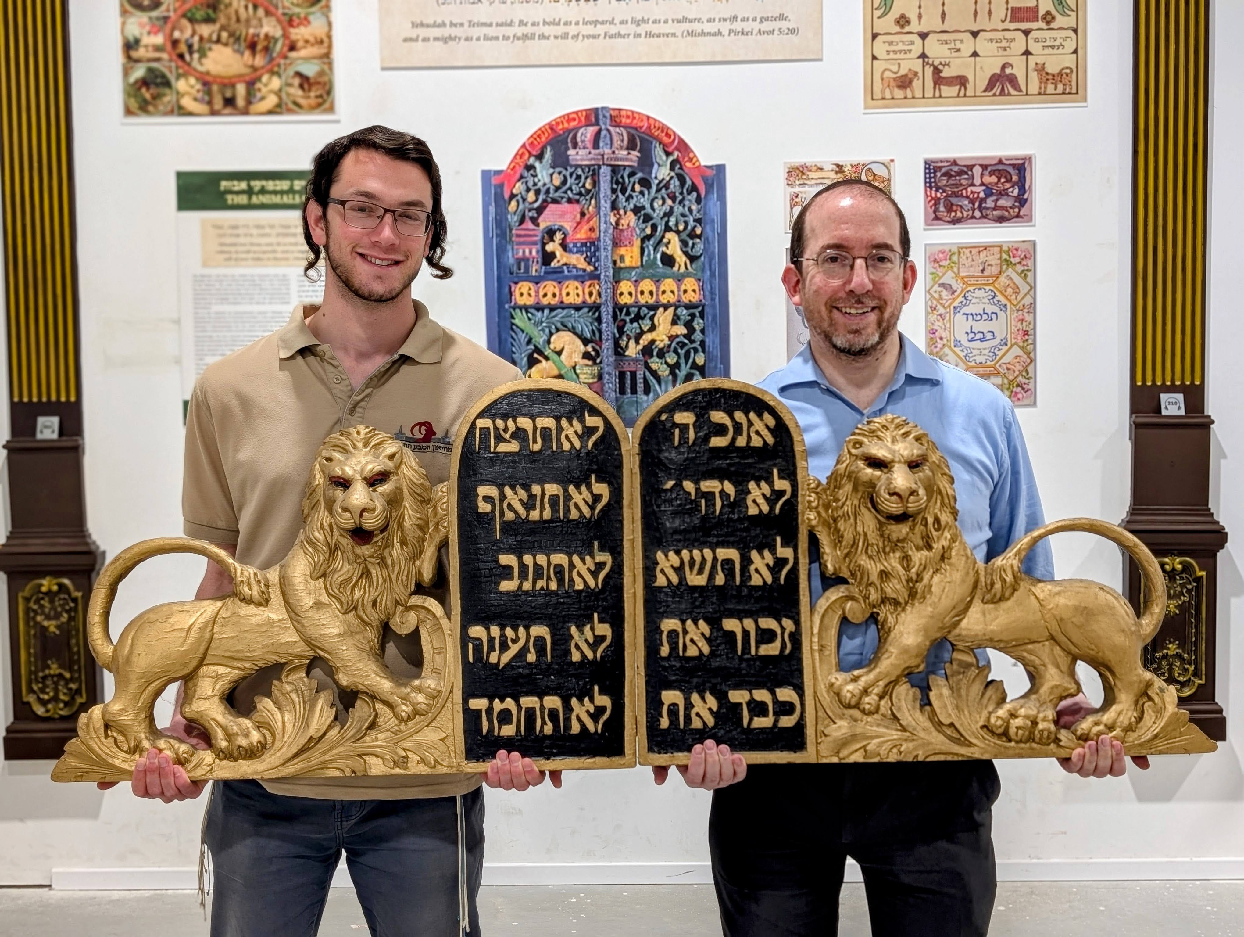 Once I’d gotten out of the traffic and managed to park, I made my way back to the store. And there they were - an original huge pair of carved lions, painted gold, from an early 20th century Lower East Side synagogue. The owner actually had several pairs - he had purchased all of the ones that were put on auction! Of course they were very expensive, but I reached out to Dr. Weiss and he was delighted to purchase the most beautiful pair and add them to his Pirkei Avot Aron HaKodesh.