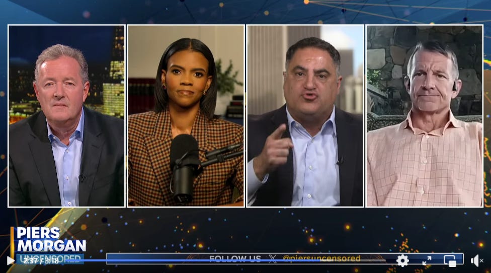 A similar phenomenon happend with Piers Morgan. He hosts a panel which has become a shouting-match that platforms the most horrible and deranged anti-Western and antisemitic activists, as well as complete ignoramuses who are spouting their views about geopolitics and the morality of war. Piers invited Ben, a former guest, to return to his show, and Ben refused, explaining that he doesn’t want to appear on a show that has degenerated into a “clown car of stupidity.” Piers responded by claiming that Ben is trying to cancel him for being critical of Israel!