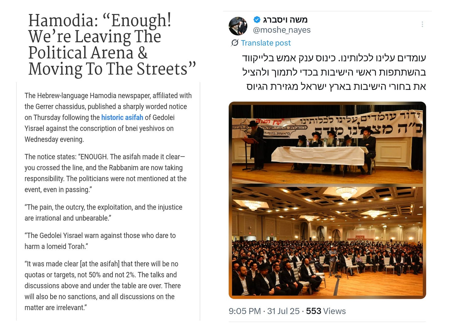 Internally, aside from the terrible losses and suffering of the past two years, we are also faced with unprecedented national division. The entire rabbinic and political leadership of the charedi sector, representing about a fifth of the current Jewish population of Israel and a third of the next generation, have effectively declared their secession from the nation. They publicly stated in three events - during the Nine Days! - that they are wholly opposed to helping relieve the war’s burden on the rest of the nation in the slightest. They made it clear that they do not care about the suffering of the rest of the people, and they only want to extract resources from them. In Lakewood, they compared those who want the charedim to help ease the burden of national defense (i.e. most of Israel) to the enemies of the Jews described in VeHe She’Amda.