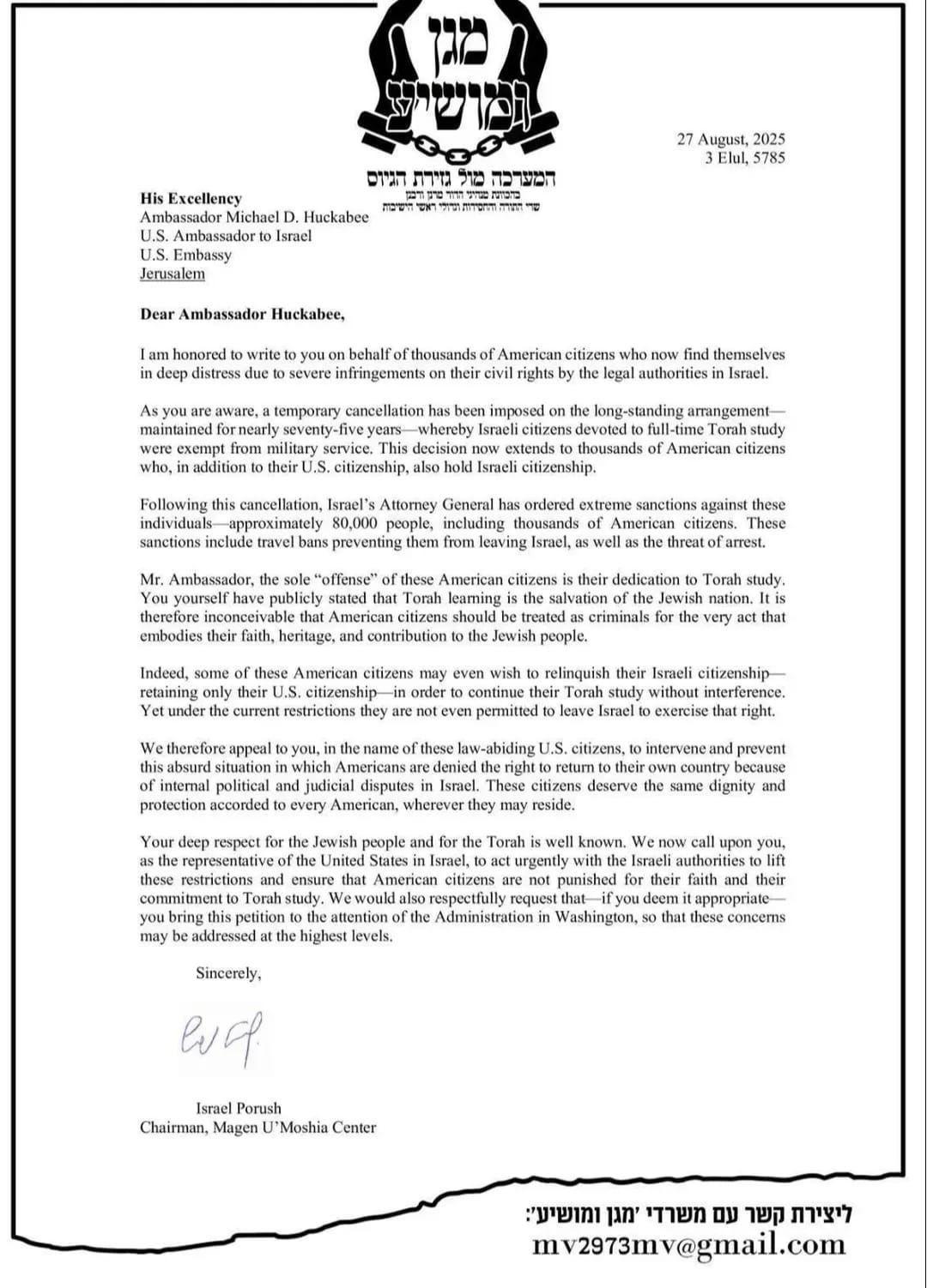 But Hofstedter is not alone in trying to recruit non-Jewish allies to the charedi cause and against the IDF, the justice system, and the general Israeli public. Yisrael Porush is the son of MK Meir Porush and chairman of Magen u’Moshia, the “Campaign against the Enlistment Decree,” whose logo features hands in handcuffs. He too appealed to Ambassador Huckabee to recruit the US Adminstration (who he apparently considers to be the real Magen u’Moshia):