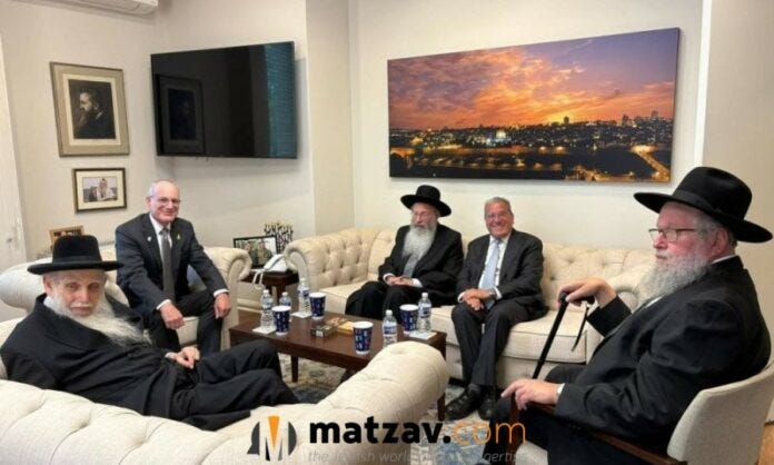 And it doesn’t end there. Three members of the Moetzes Gedolei HaTorah of Agudas Yisroel of America traveled to Washington, D.C. yesterday for a meeting with Yechiel Leiter, Israel’s ambassador to the United States. These were Rav Aharon Feldman, Rav Malkiel Kotler, and Rav Elya Brudny (who made it clear last year that he does not consider Dati-Leumi Jews to be religious).