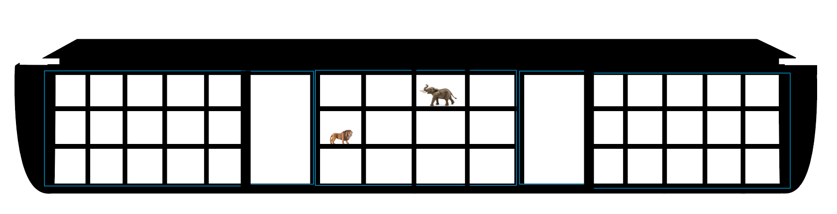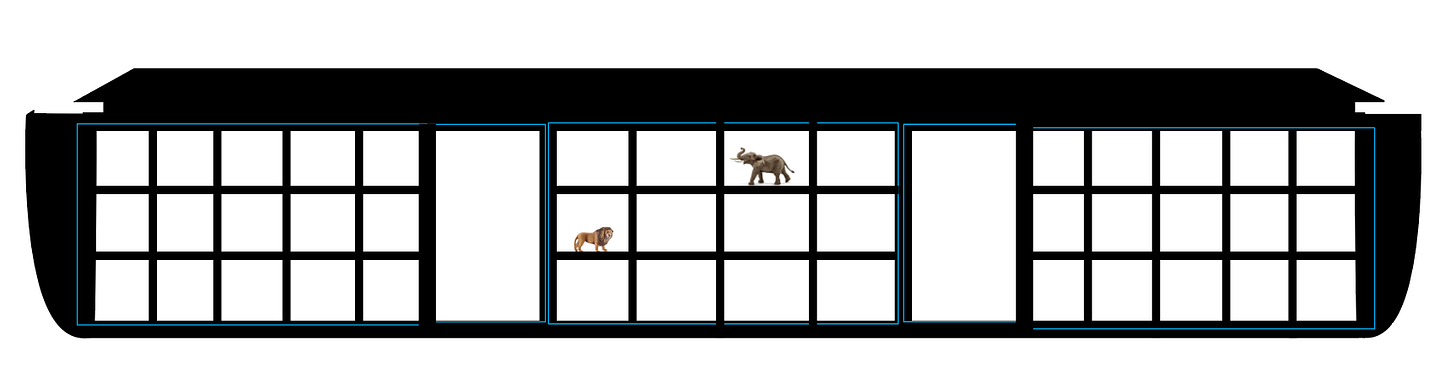 And there’s one final innovation that I would love to include: a miniature conveyor belt traveling around the ark and through the interior, like those in airports, on which the animals would travel. It would both add immense aesthetic appeal, and also provide a useful and fun place from which to retrieve the animals for each challenge and to which to return them after each challenge is completed.