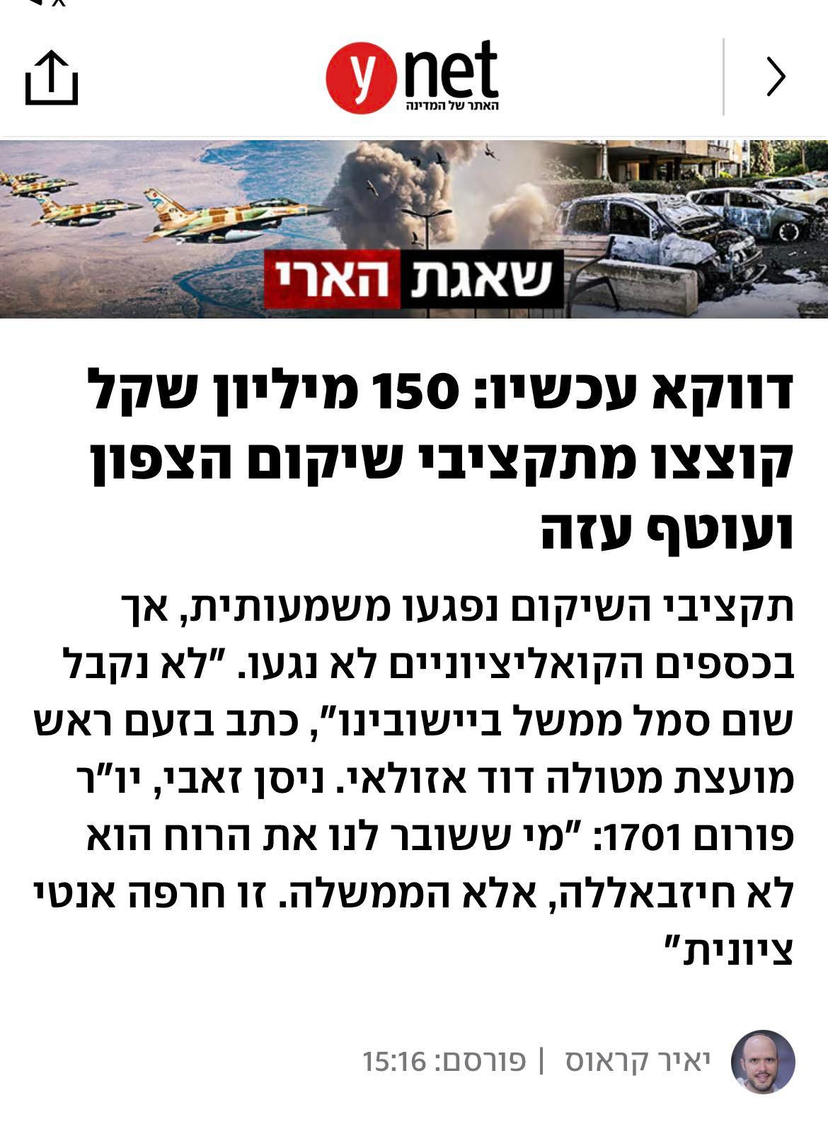 And yet while 150 million shekels were removed from the rehabilitation budget for battered towns, the government sends billions of shekels to yeshivos and supporting deliberately underemployed charedim! This includes millions to yeshivos for “kids at risk,” which are designed to ensure that they stay in the charedi framework even if they are not learning, so that they don’t enlist. It’s perverse. Community leaders in the battered north have commented that while Hezbollah and Iran have caused them financial catastrophe, it’s the actions of the current Israeli government which have crushed their spirit.