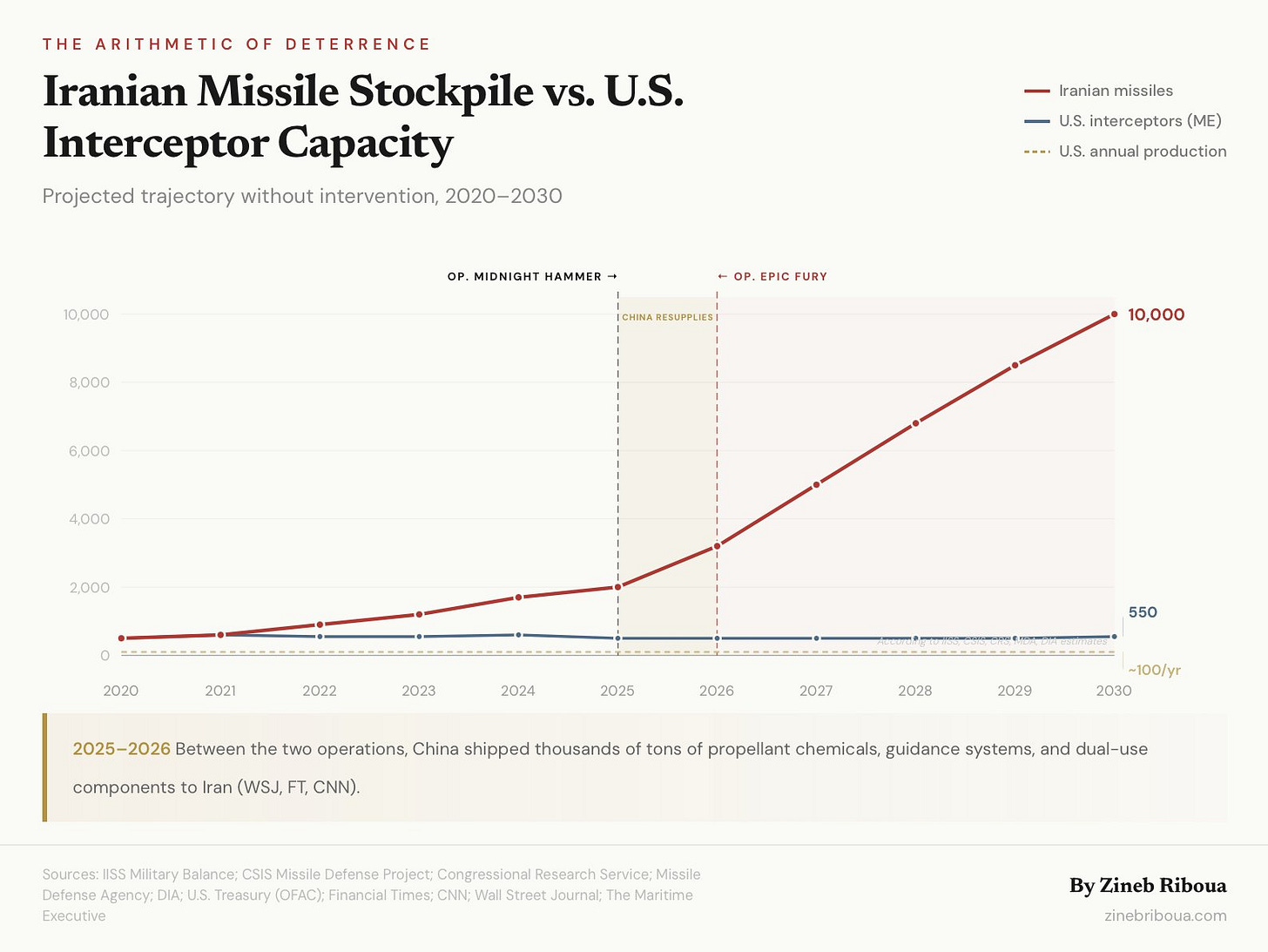 The second picture is a chart which shows the rate of production of ballistic missiles, compared with the rate of production of missile interceptors, taken from an excellent article on the topic: